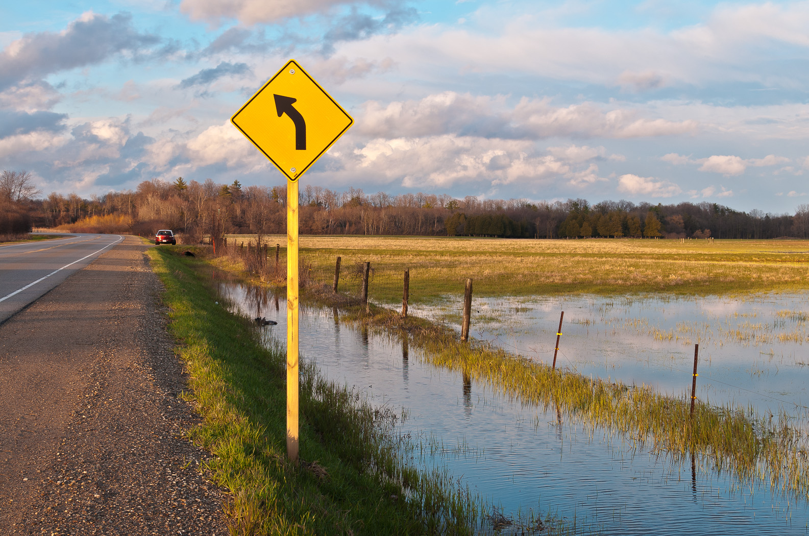 Driving to Guelph last week I came across this flooded field with just the right clouds and just the right lighting. Each shot is a high dynamic range (HDR) composite of three images separated with a stop of exposure difference between each. Yes, that’s my Mazda 3 parked up ahead in the first image.