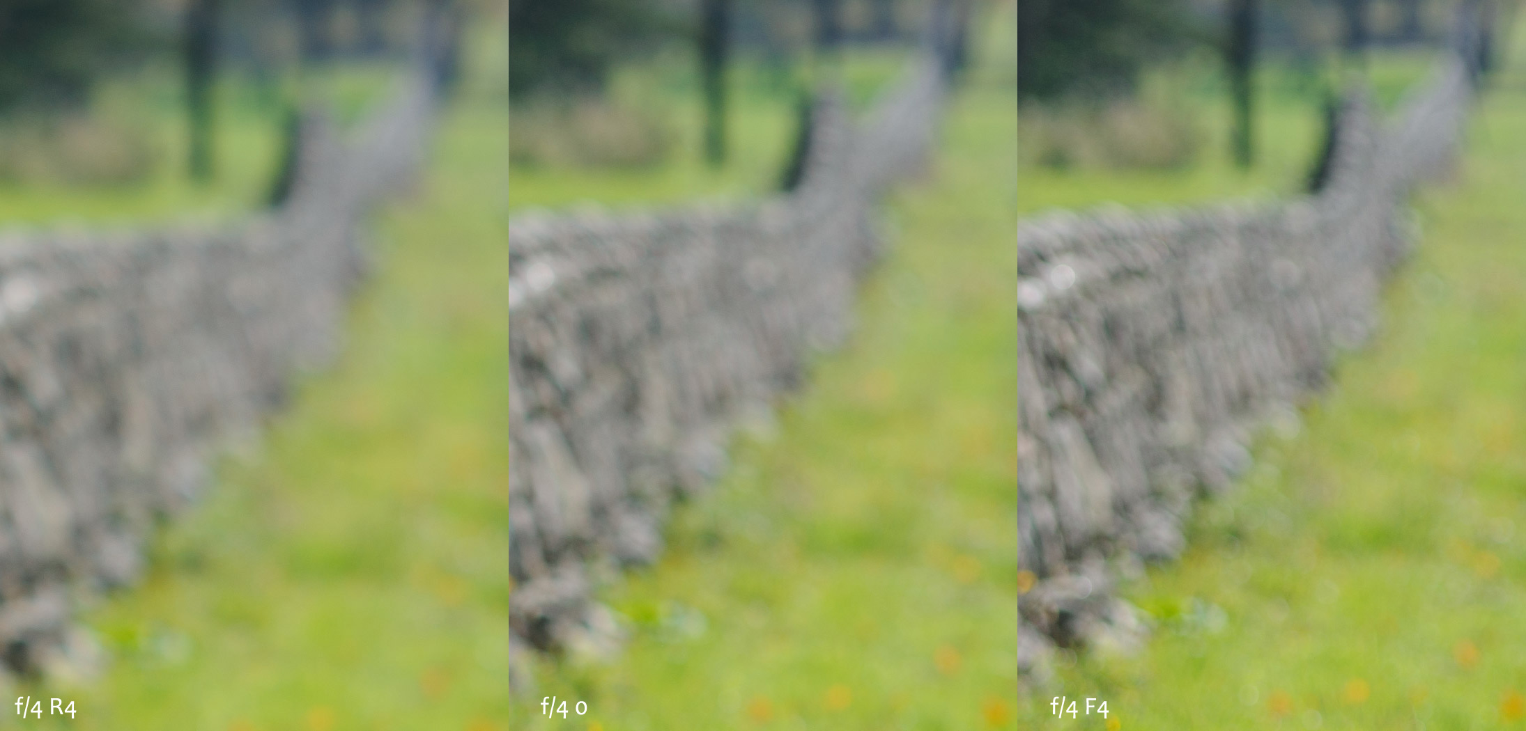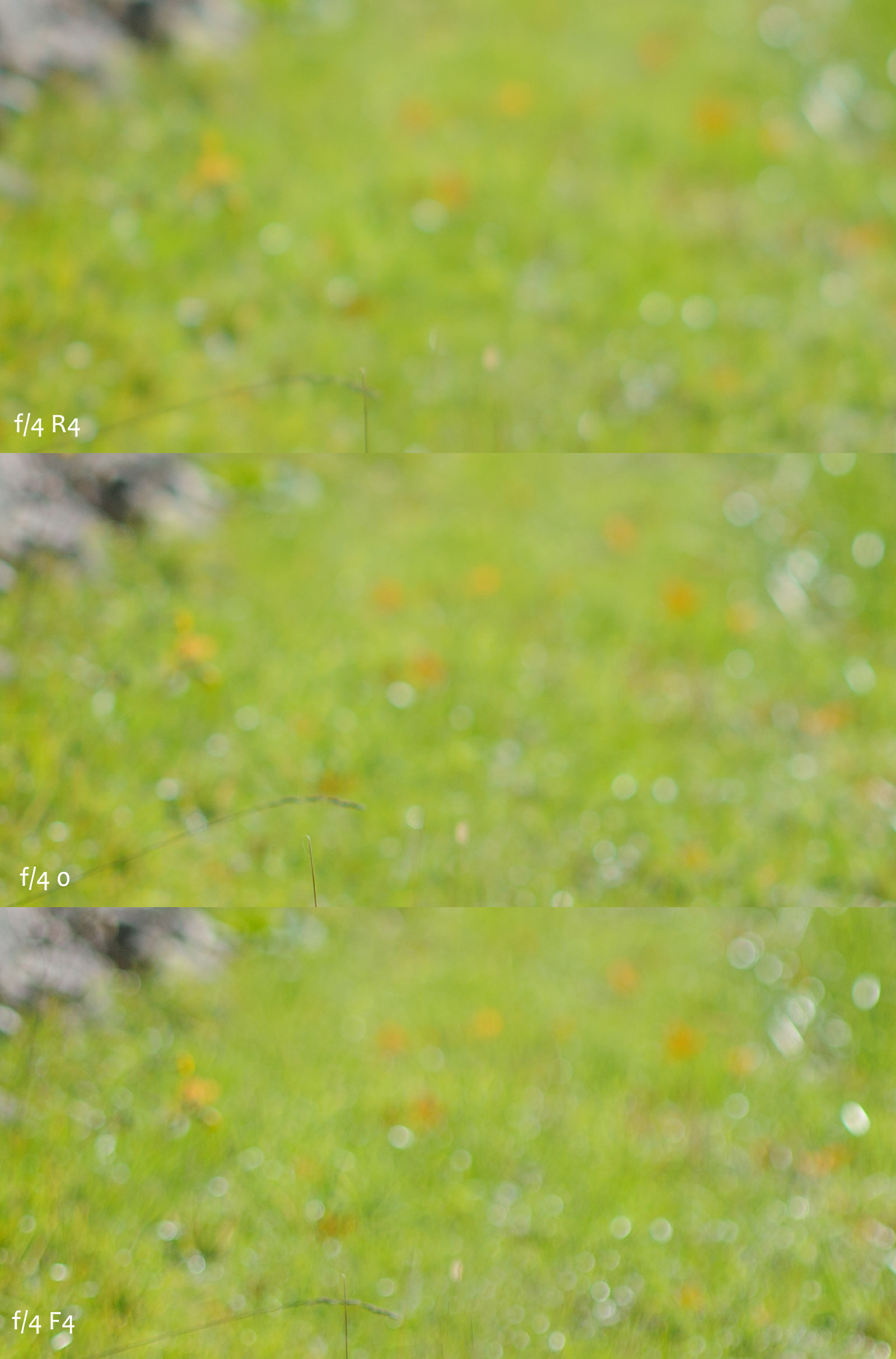 Turning the control ring in the R direction improves the quality of bokeh behind the subject (but has a negative impact on foreground blur). Likewise, Turning in the F direction improves the bokeh in front of the subject (but noticeably hurts the background blur). Here is a demonstration, with three images of the same subject at f/4. The first is with the control ring at 0. The next is with the control ring at 4 in the R direction. The third is with the control ring at 4 in the F direction. Notice the subtle difference in bokeh at the foreground and background.